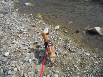 まずは、時間。 朝、早すぎると、河原の草が濡れており、 昼間は、日差しが強く、ばててしまう。 夕方は、他のワンちゃんも散歩中で、 我が家の2ワンがギャンギャンとご迷惑をかけてしまう。 AM9時☆この時間がベスト 前回は10時前だったので、釣りをしているおじいさんに 2ワンが大騒ぎ。 今回は9時 見渡す限り、人もワンちゃんもおりません。 まずは、周囲とにおいのチェックにはげむチェルシーとヂヂ 右OK! 左OK!! この石渡りは、お転婆チェルシーも苦手。 2ワンを抱いて、落とさないように、 自分も落ちないように、、、 水辺の水をチョロっと味見して、満足なチェルシー。 ヂヂは水辺へ近づこうとしません。 ちょっと怖いんだね。 |