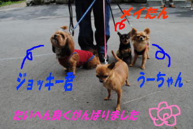 昨日をもちまして~ チェルシーしつけ教室卒業ということに あいなりました!! チェルシーの場合、チケットがなくなったので、 終了?ってことになるのかな? ともあれ、かわいがっていただいた 先生ともしばしのお別れです。 先生は優しい眼差しをチェルシーに送って下さってます。 チェルシー!もうちょっと愛想よく! 最後のマンツーマンレッスンの始まりです。 !感動のノーリードのついて! ここまで成長して感激♪っと喜んだのもつかの間・・・ トコトコ先生から離れて私の方にやってくるチェルシー もちろん! 先生につかまってしまいます! 先生曰く、優しくする時と、叱る時のメリハリが大切とか。 教室に通い出したらどれ程利口な犬にらるかしらん。 もしかしてチワワ警察犬モモちゃんみたいになったりして! と、淡い期待を抱いていましたが・・・ そりゃそうよねっというほどほどの成長をとげてくれました。 それでは・・・ 警察犬モモちゃんに極近に優秀な うーちゃんメイたん(チェルシーと血が繋がってます<強調>)と もうすぐ卒業予定のジョッキー君とで 記念の卒業写真!! チェルシー頑張ったね。 PR |